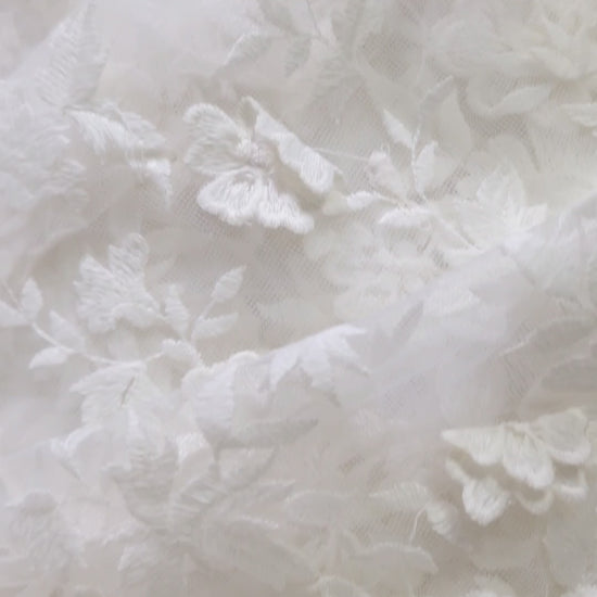 Diese romantissche, florale Spitze ist mit kunstvoll gefertigten 3D Blumenapplikationen verziert, die dem Stoff eine luxuriöse Textur und Tiefe verleihen. Ideal geeignet für Brautkleider, Brautjäckchen, Ärmel und als dekorative Einsätze. Diese Spitze lässt sich hervorragend für Hochzeitsaccessoires wie Haarschmuck, Schleier und vieles mehr verwenden. Die floralen Muster und die zarten Details machen diesen Stoff zu einer eleganten Wahl für jede Hochzeit.