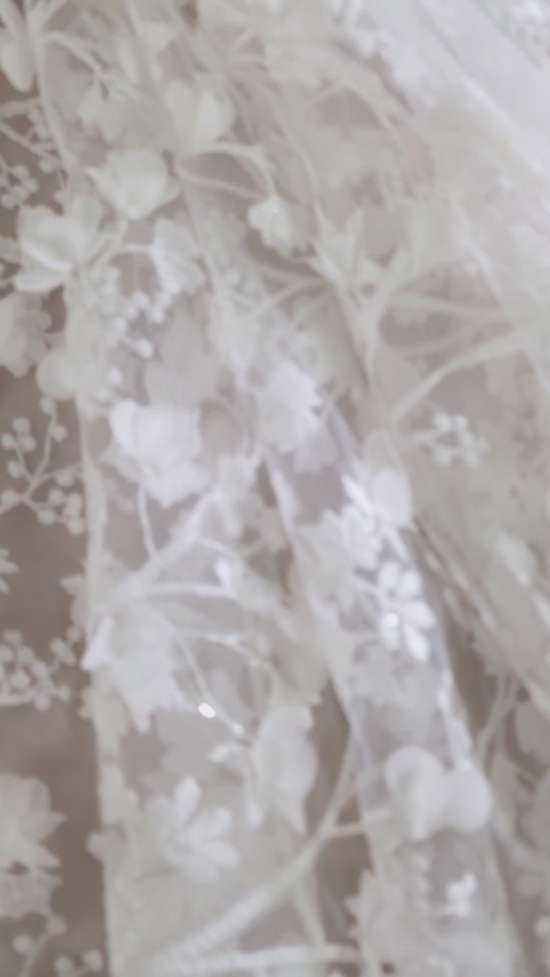 Verleihen Sie Ihrem Hochzeitskleid eine besondere Eleganz mit dieser luxuriösen, handbestickten Brautspitze. Die filigranen, dreidimensionalen Blüten und feinen Verzierungen aus Perlen und Fäden verleihen dem Stoff eine anmutige und elegante Note. Diese exquisite Brautspitze eignet sich hervorragend für Brautkleider, Abendkleider oder Couture-Designs, die nach einem einzigartigen, floralen Akzent verlangen.